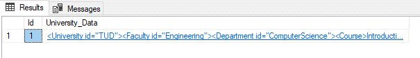 CREATE TABLE [dbo].[University_Details]( [Id] [int] NULL, [University_Data] [xml] NULL ) |