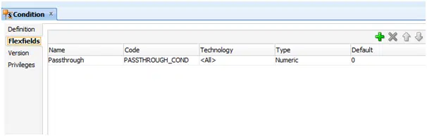 In a first step we need to define a Numeric type Flexfield on the Condition object. We name this field Passthrough