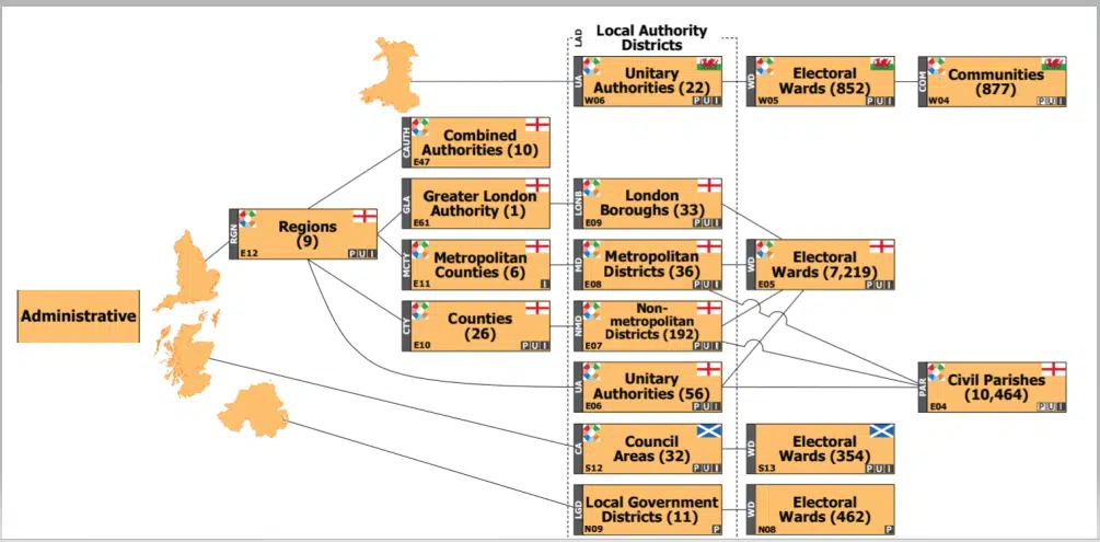 Admin boundaries of the UK are divided into various groups which get further divided into sub groups. For a better understanding let’s go through this diagram.