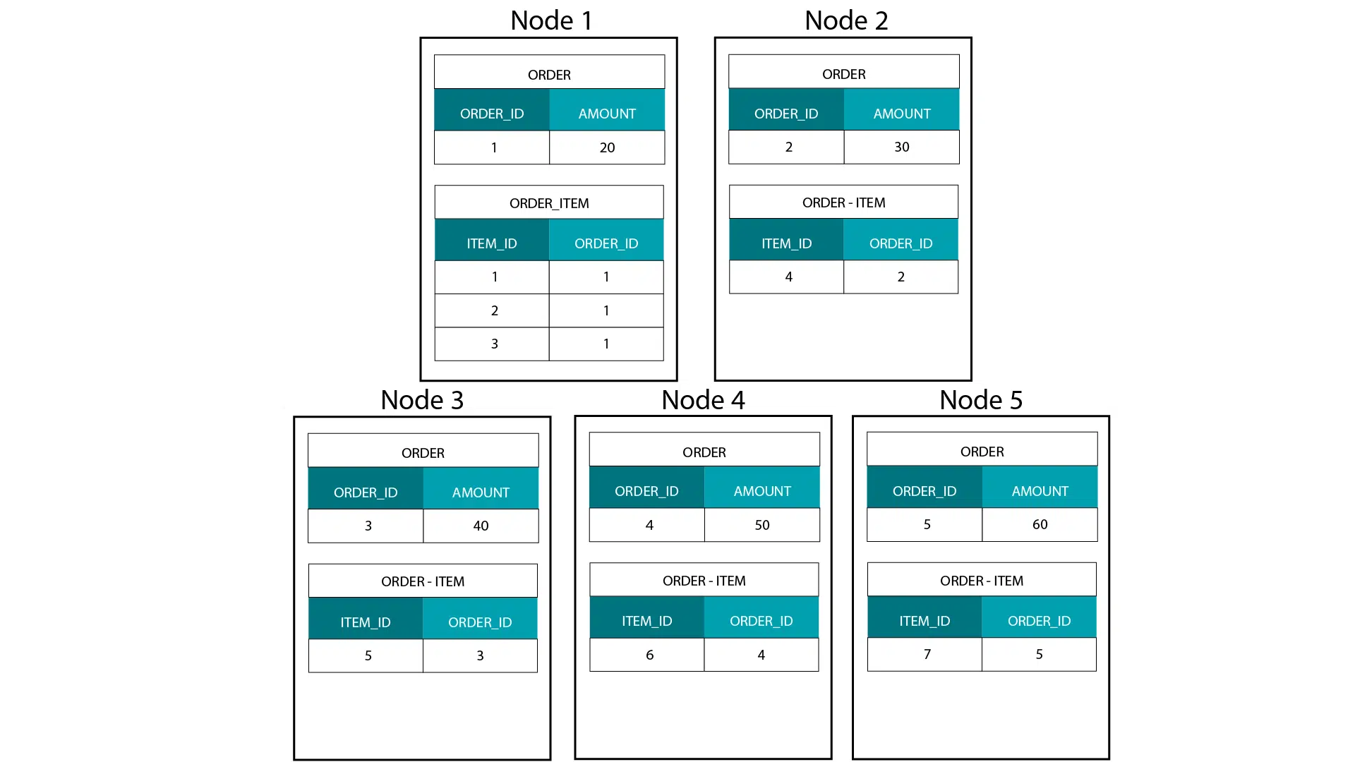 The other important concept that we need to understand in relation to an MPP is that all nodes take part in the processing when we run a query against the ORDER or ORDER_ITEM table or join them together.
